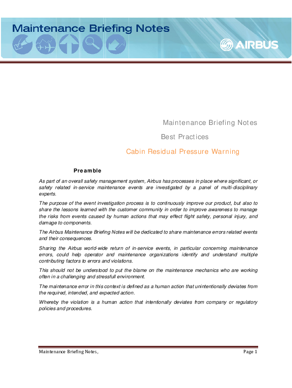 Maintenance Briefing Notes: Cabin Residual Pressure Warning