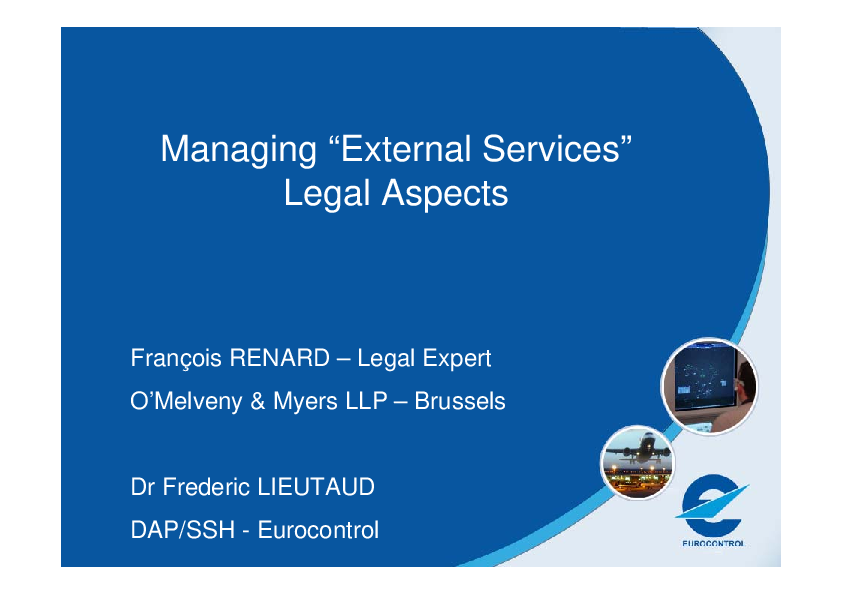 This presentation provides guidance for selecting and managing external services and describes the legal landscape - overview of the European rules, EUROCONTROL and EUROPEAN COMMISSION rules and provides the specific requirements for external services.