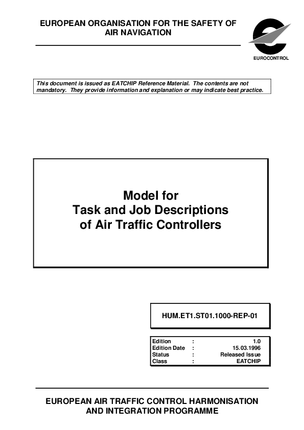 The Job Description Task Force of the Human Resources Team in EATCHIP has developed a model for Task and Job Descriptions of Air Traffic Controllers. The report describes the method used, results and conclusions for current and future work of the Task Force. Results and conclusions highlight the relevance of cognitive aspects in controller tasks which have important impact for selection, training, licensing and working practices of Air Traffic Controllers and future development of new procedures and technical equipment.