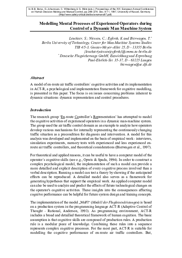 Modelling Mental Processes of Experienced Operators during Control of a Dynamic Man-Machine System