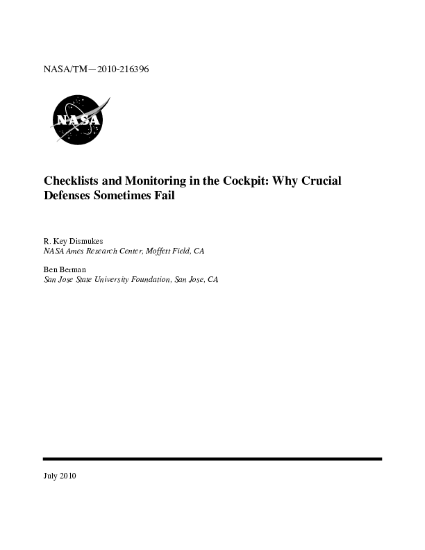 NASA/TM-2010-216396 Checklists and Monitoring in the Cockpit: Why Crucial Defenses Sometimes Fail