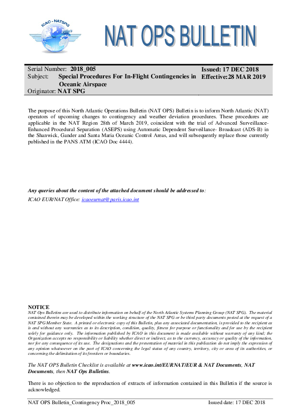 The purpose of this North Atlantic Operations Bulletin (NAT OPS) Bulletin is to inform North Atlantic (NAT) operators of upcoming changes to contingency and weather deviation procedures. These procedures are applicable in the NAT Region 28th of March 2019, coincident with the trial of Advanced Surveillance-Enhanced Procedural Separation (ASEPS) using Automatic Dependent Surveillance- Broadcast (ADS-B) in the Shanwick, Gander and Santa Maria Oceanic Control Areas, and will subsequently replace those currently published in the PANS ATM (ICAO Doc 4444).
