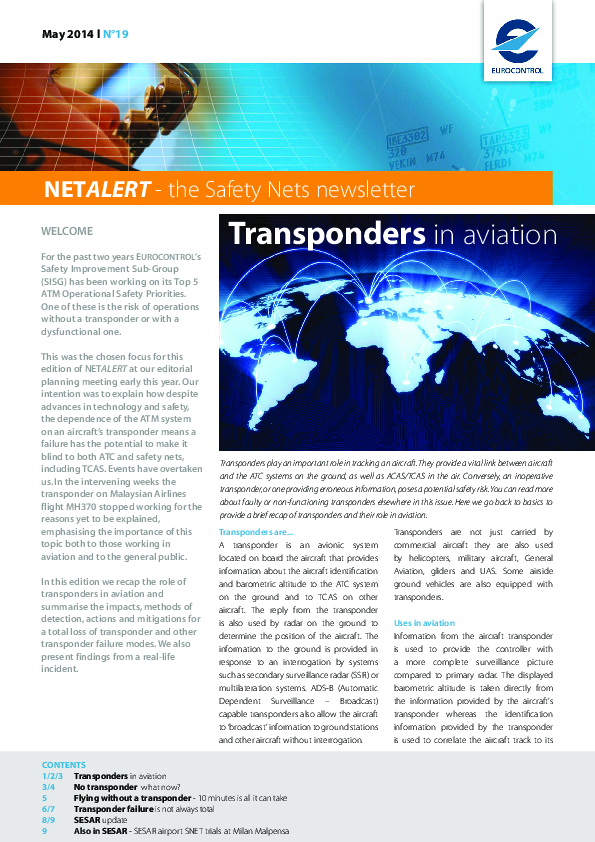 19th edition of EUROCONTROL's safety nets newsletter published in May 14, titled Transponders in aviation.