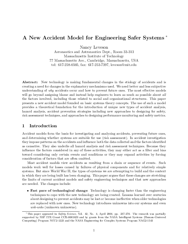 New technology is making fundamental changes in the etiology of accidents and is creating a need for changes in the explanatory mechanisms used. We need better and less subjective understanding of why accidents occur and how to prevent future ones. The most effective models will go beyond assigning blame and instead help engineers to learn as much as possible about all the factors involved, including those related to social and organizational structures. This paper presents a new accident model founded on basic systems theory concepts. The use of such a model provides a theoretical foundation for the introduction of unique new types of accident analysis, hazard analysis, accident prevention strategies including new approaches to designing for safety, risk assessment techniques, and approaches to designing performance monitoring and safety metrics.