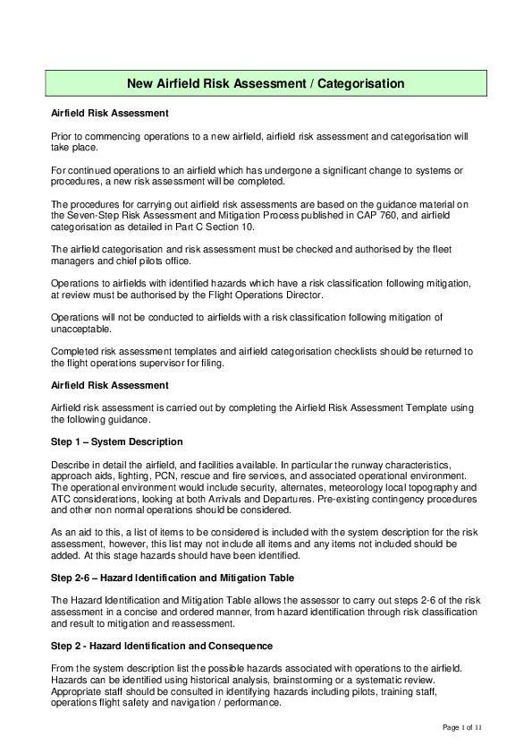 This document contains procedures for carrying out airfield risk assessments that are based on the guidance material on the Seven-Step Risk Assessment and Mitigation Process published in CAP 760, and airfield categorisation as detailed in Part C Section 10.