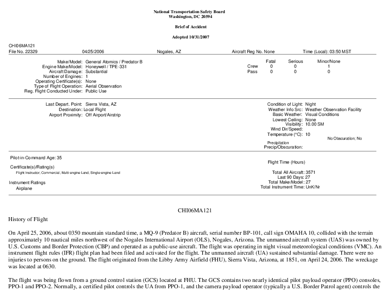 NTSB - Accident - CHI06MA121, Predator B, Nogales AZ, 2006 (LOC HF)