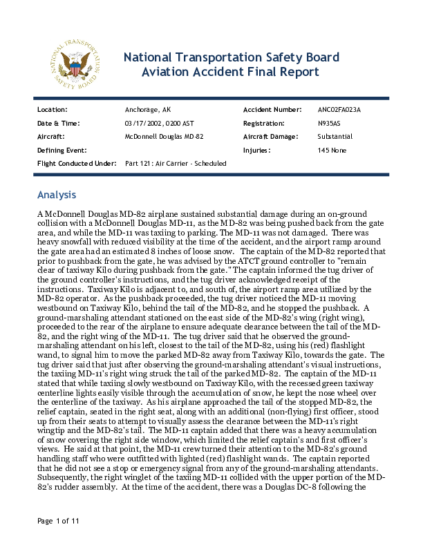 NTSB - ANC02FA023A, MD82 / MD11 ground collision during pushback, Anchorage AK, 17 Mar 2002