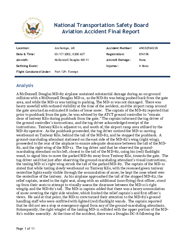 On 17 March 2002, at Ted Stevens Anchorage Airport, a McDonnell Douglas MD82 operated by Alaska Airlines, on a night pushback in snow conditions collided with an inbound taxiing McDonnell Douglas MD-11. The MD82 suffered substantial rudder damage although the impacting MD11 winglet was undamaged.