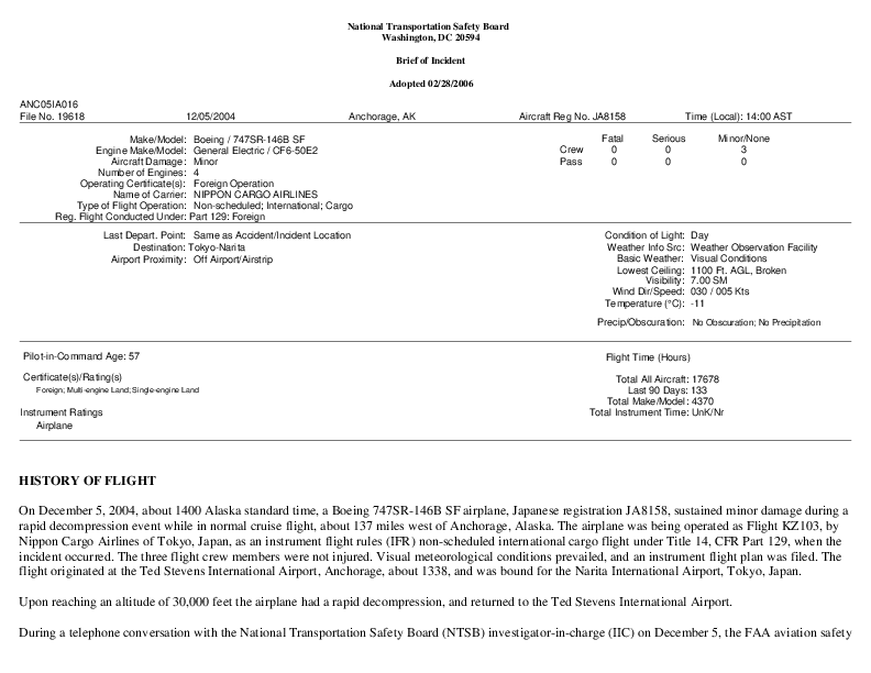 NTSB - ANC05IA016, B74S Rapid depressurisation, en-route, Anchorage AL USA, 5 Dec. 2004 (AW)