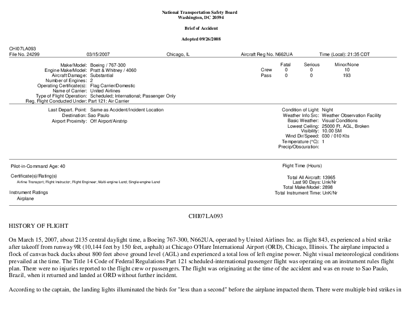 NTSB - CHI07LA093 B763 bird strike Chicago O'Hare IL, 15 March 2007