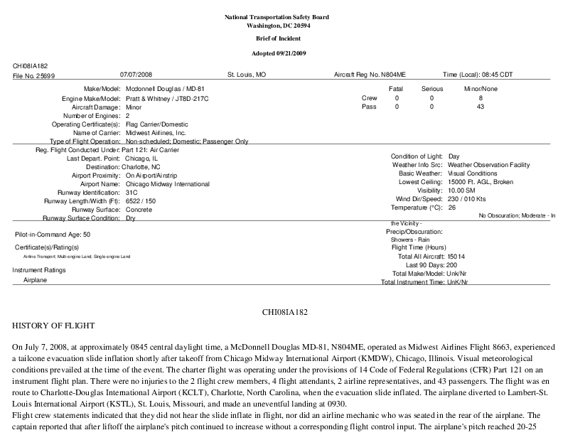 NTSB - CHI08IA182, MD81 Inflight tailcone inflation Chicago Midway 7 July 2008