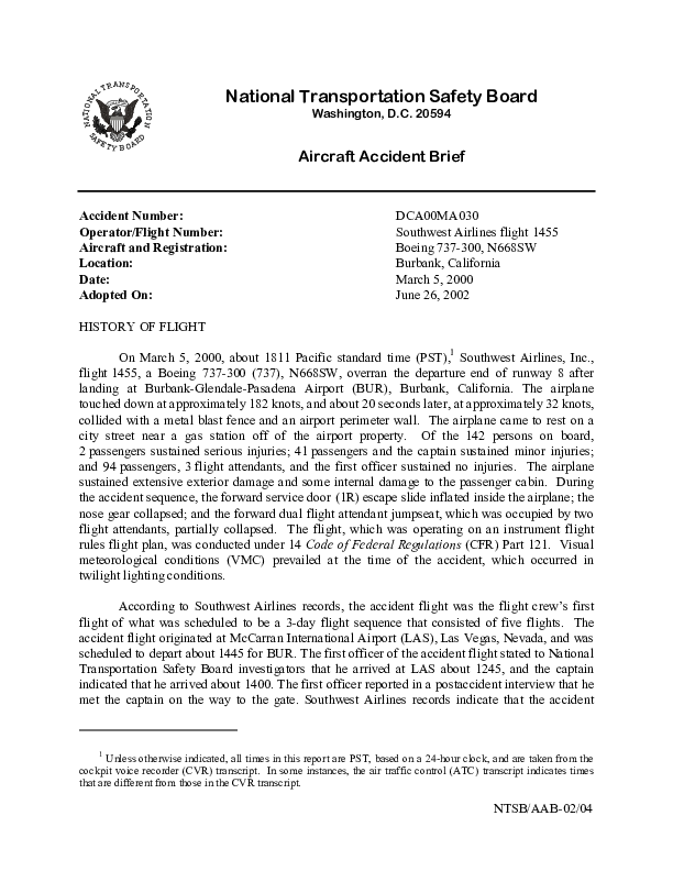 On 5 March 2000, a Boeing 737-300 being operated by Southwest Airlines on a scheduled passenger flight from Las Vegas to Burbank overran the landing destination runway in normal day visibility after a steep visual approach had been flown at an abnormally high speed. The aircraft exited the airport perimeter and came to a stop on a city street near a gas station. An emergency evacuation of the 142 occupants led to 2 serious injuries and 42 minor injuries and the aircraft was extensively damaged.