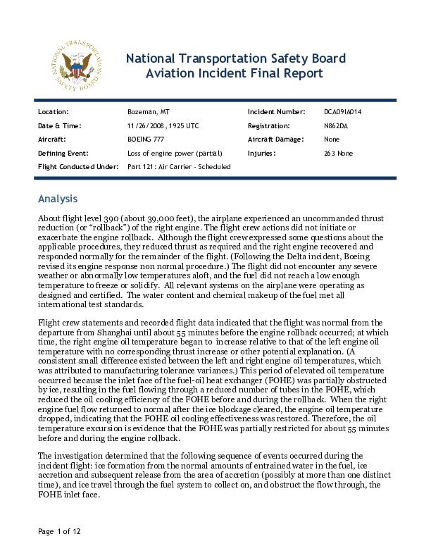 NTSB - DCA09IA014, B772 accumulation of ice in fuel system, en-route Bozeman MT USA, 26 Nov 2008