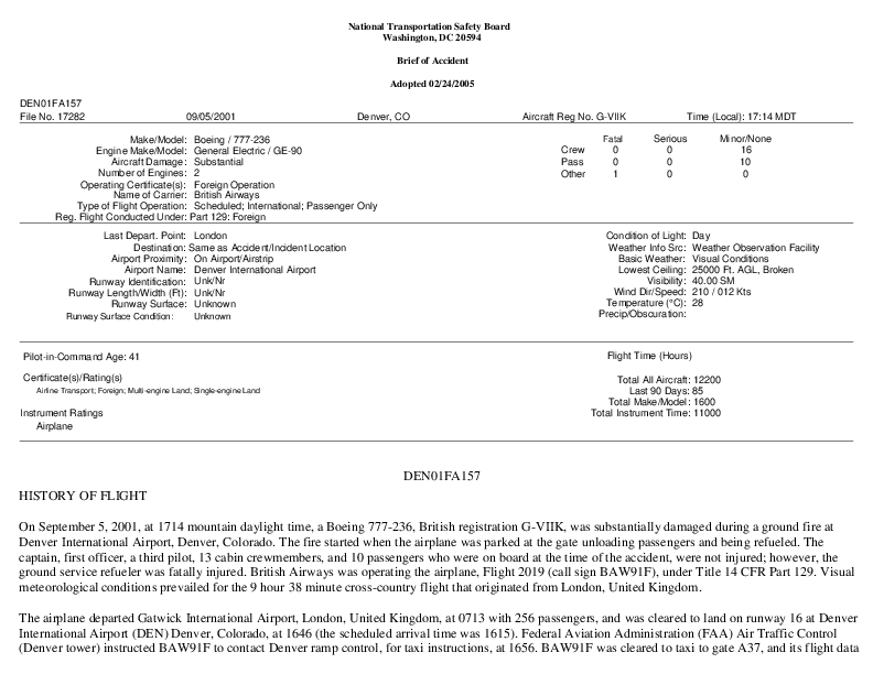 NTSB - DEN01FA157 B772 fire during refueling, Denver CO, 5 Sept 2001