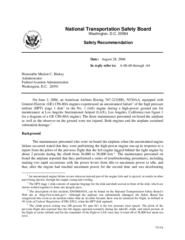 On June 2, 2006, an American Airlines Boeing 767-200ER fitted GE CF6-80A engines experienced an uncontained failure of the high pressure turbine (HPT) stage 1 disc in the No. 1 engine during a high-power ground run carried out in designated run up area at Los Angeles for maintenance purposes during daylight normal visibility conditions. The three maintenance personnel on board the aircraft as well as two observers on the ground were not injured but both engines and the aircraft sustained substantial damage from the fuel-fed fire which occurred as an indirect result of the failure.