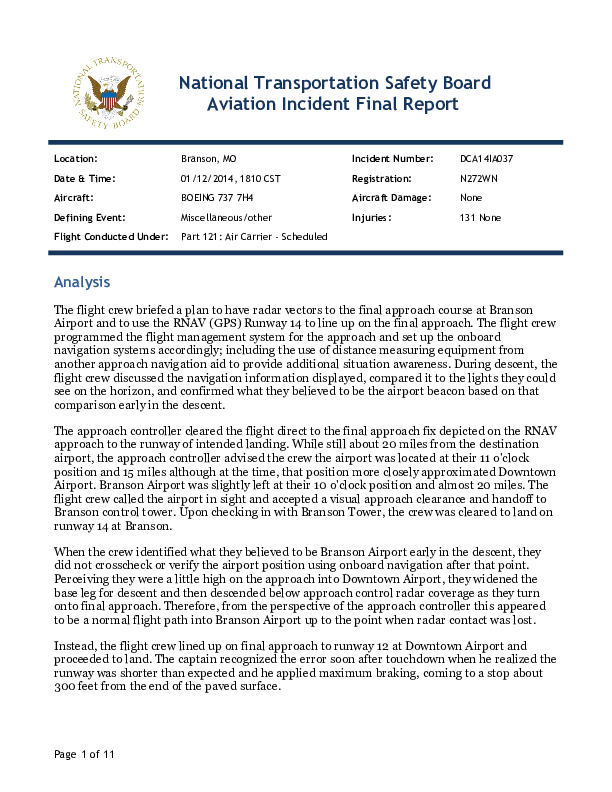 NTSB Identification: DCA14IA037: B737 vicinity Branson MS USA 12 Jan 2014 Wrong Airport