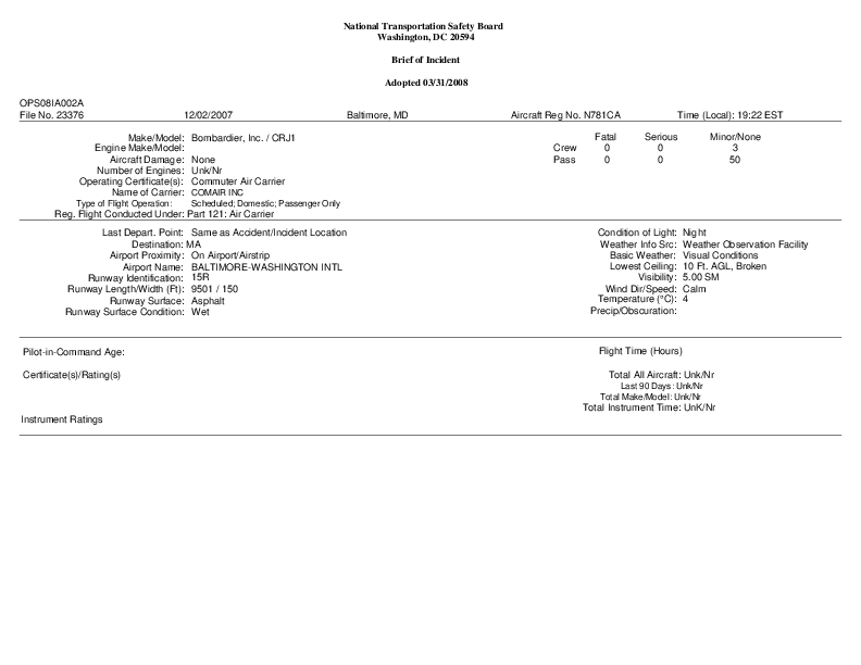 NTSB - OPS08IA002 CRJ1/A320 Runway incursion, Baltimore MD, 2 Dec 2007