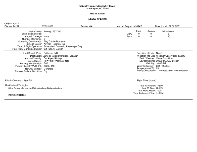 NTSB - OPS08IA007 B737 and A332 runway incursion, Seatle-Tacoma WA, 2 July 2008