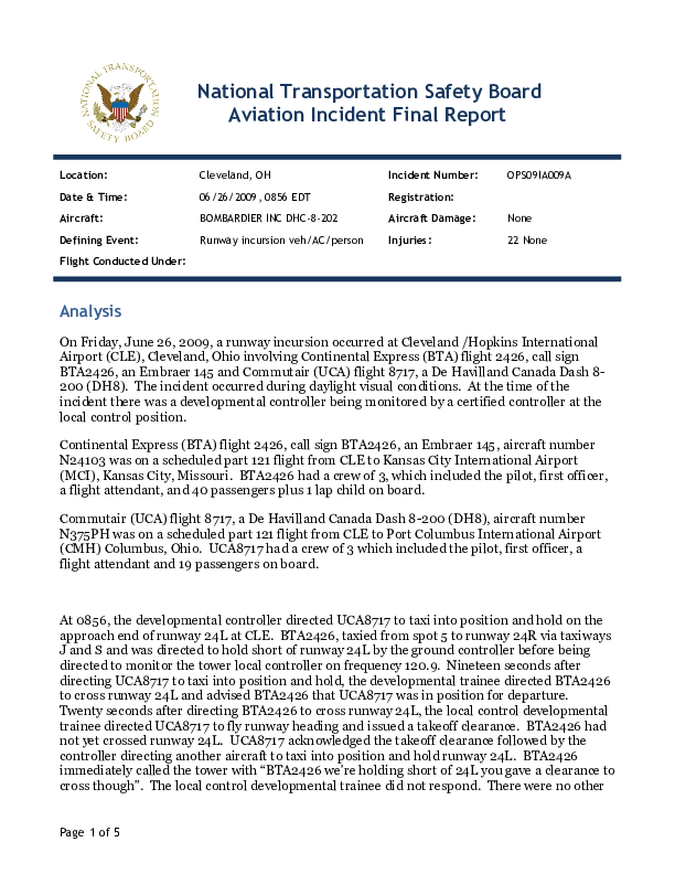 NTSB - OPS09IA009A, Runway Incursion, DH8B/E145, Cleveland OH, 26 Jun 2009
