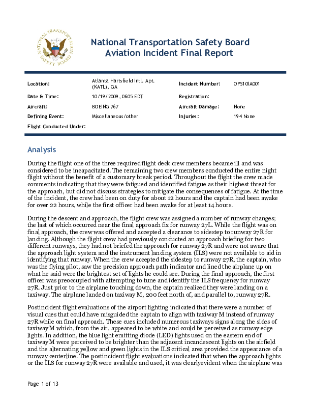 On 19 October 2009, a Boeing 767-300 being operated by Delta Airlines on a scheduled passenger flight from Rio de Janeiro to Atlanta inadvertently made a landing at destination in night VMC on parallel taxiway ‘M’ instead of the intended and ATC-cleared landing runway 27R. None of the 194 occupants were injured and there was no damage to the aircraft or conflict with other traffic or vehicles. The third rostered crew member had become incapacitated en route with the consequence that neither of the other pilots had been able to take any in flight rest.