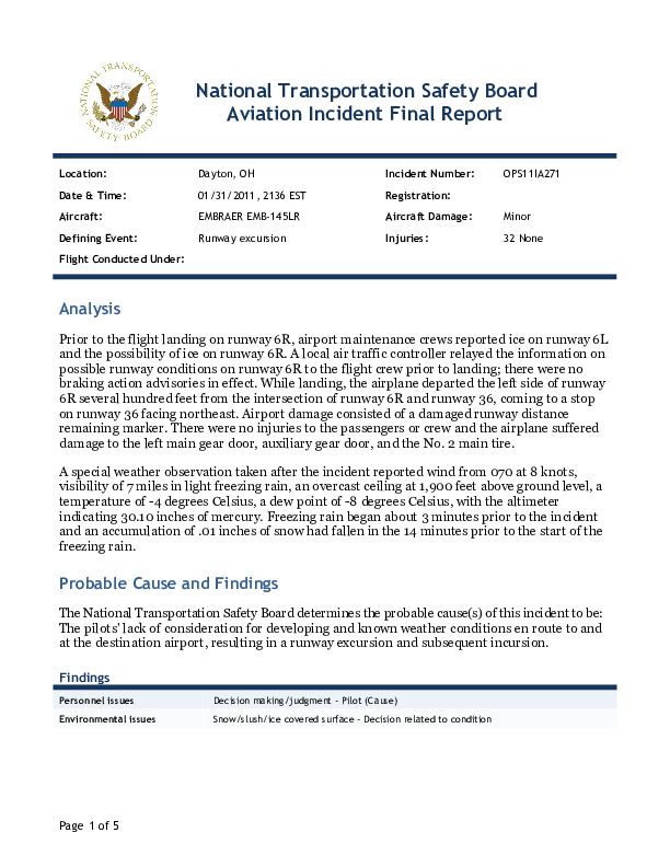 NTSB Report OPS11IA271, E145 runway excursion, Dayton OH, 31 Jan 2011