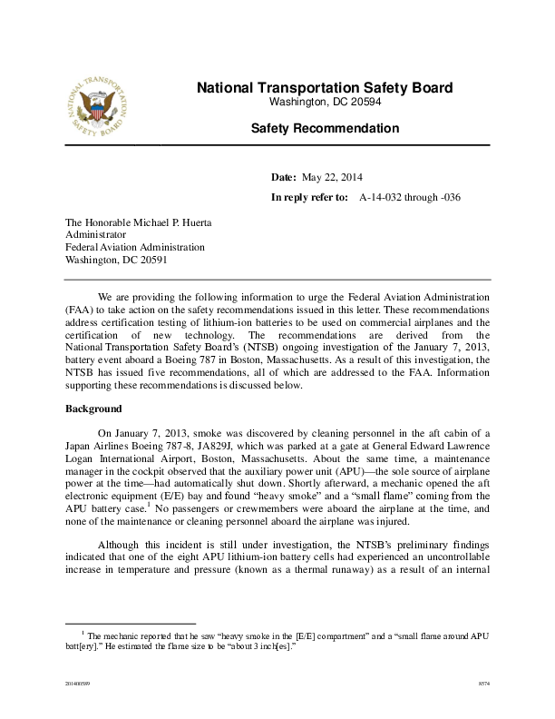 NTSB Safety Recommendation Letter to the FAA dated 22 May 2014 regarding certification and testing of lithium-ion batteries used on commercial aircraft.