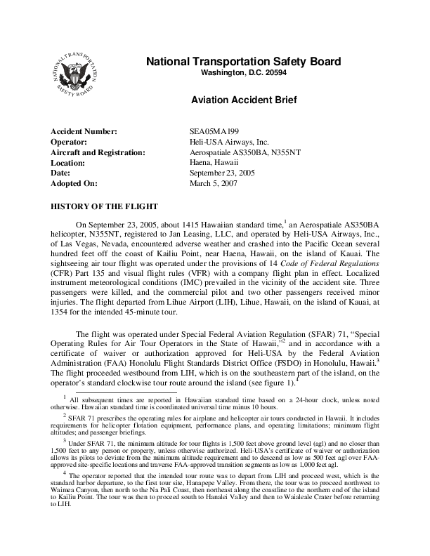 On 23 September 2005, an AS350 helicopter, operated by Heli-USA Airways, crashed into the sea off Hawaii following loss of control associated with flight into adverse weather conditions.