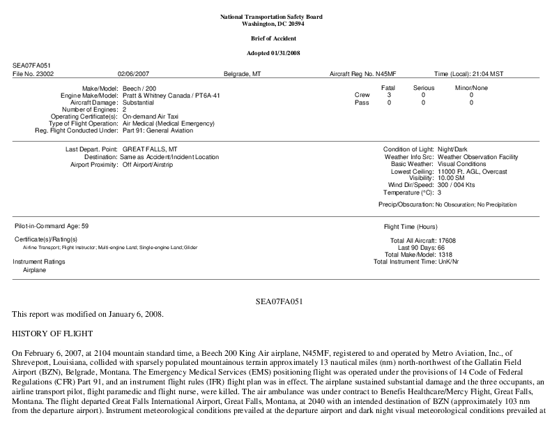 NTSB - SEA07FA051 BE20 CFIT Belgrade MT, 6 Feb 2007