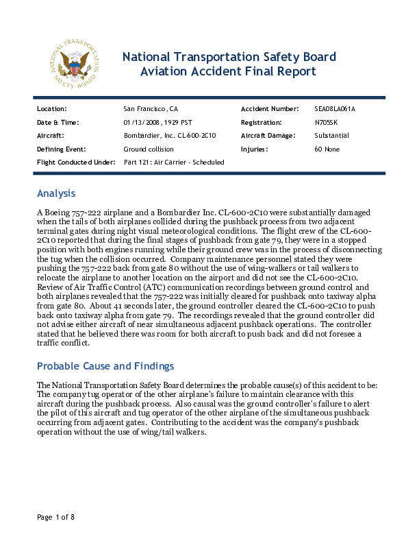 NTSB - SEA08LA061A - pushback accident B752 and CL60 San Francisco CA USA, 13 Jan. 2008