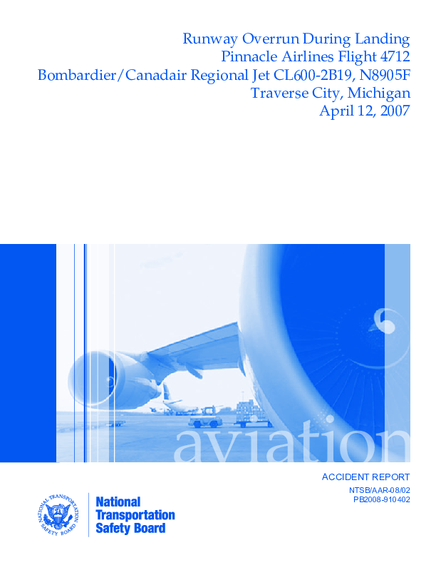 NTSB/AAR-08/02 PB2008-910402, CRJ2 Runway excursion, Traverse City MI, USA, 12 April 2007