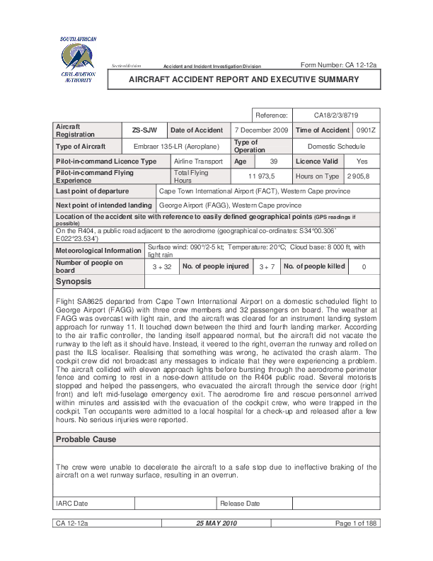 Occurrence Investigation Report, E135 Runway excursion, George, South Africa. 7 Dec 2009