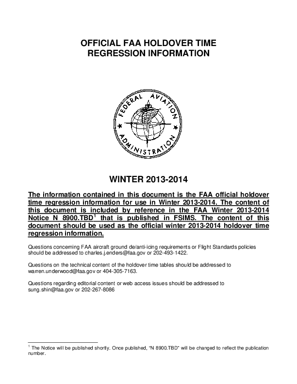 The information contained in this document is the FAA official holdover time regression information for use in Winter 2013-2014. The content of this document is included by reference in the FAA Winter 2013-2014 Notice N 8900 that is published in FSIMS. The content of this document should be used as the official winter 2013-2014 holdover time regression information.