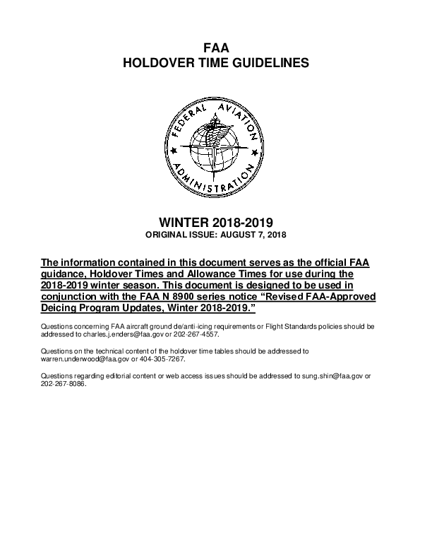 Official FAA Holdover Time Tables, Winter 2018-2019