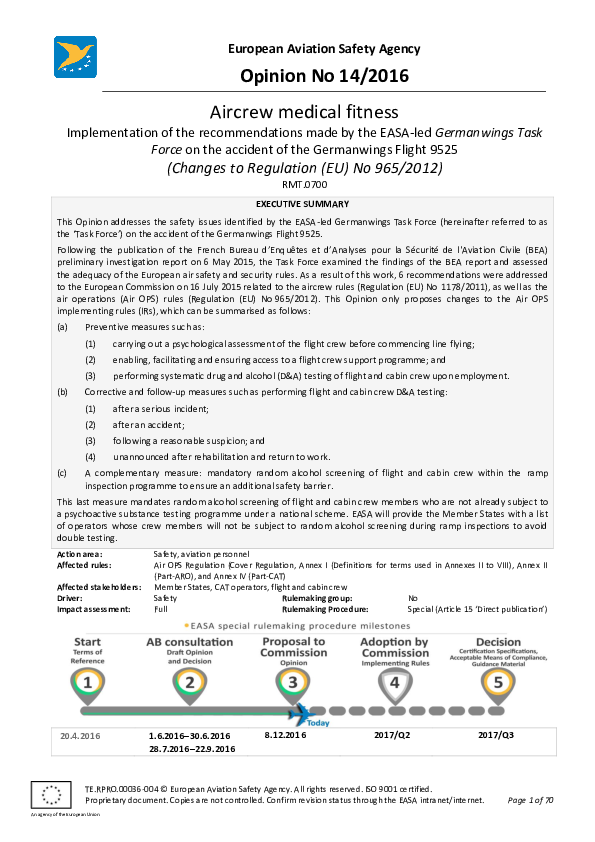 This Opinion addresses the safety issues identified by the EASA-led Germanwings Task Force (hereinafter referred to as the ‘Task Force) on the accident of the Germanwings Flight 9525.