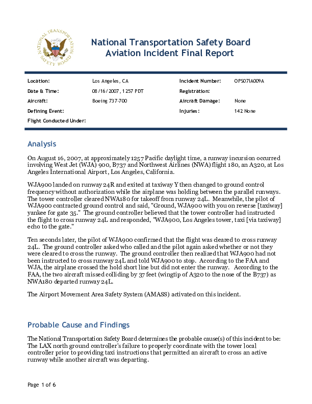 OPS07IA009A - B737 taxi in runway incursion, Los Angeles CA, USA, 16 Aug 2007