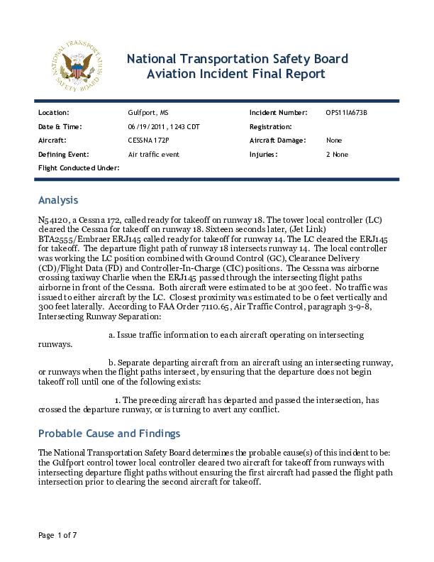 On 19 June 2011, an Embraer ERJ145 being operated by Expressjet AL on a scheduled passenger flight departing Gulfport in day VMC came into close proximity with a privately operated Cessna 172 which had just departed another runway at the same airport which had an extended centreline which passed through the centreline of the runway used by the 145. There was no manoeuvring by either aircraft and no injuries to any occupants.