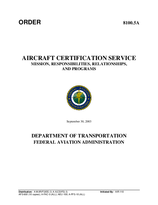 FAA Order 8100.5A Aircraft Certification Service mission, responsibilities, relationships and programs published 30 September 2003