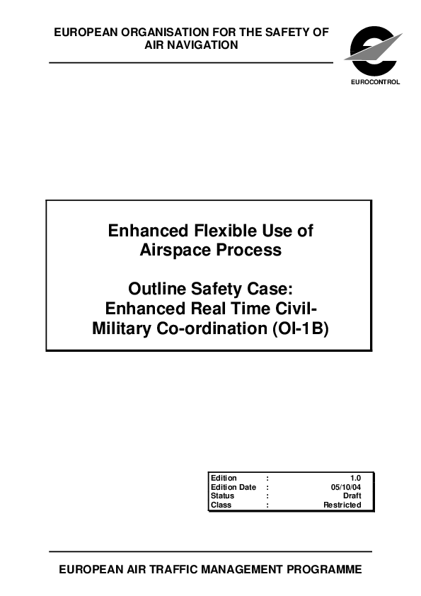 This document contains the Outline Safety Case for the Enhanced Flexible Use of Airspace Process Operational Improvement 1B (OI-1B) which concerns enhanced real time civil/ military co-ordination. It presents the argument why e-FUA OI-1B is acceptably safe in principle to implement in ECAC States together with supporting evidence. All ECAC States should verify that the assumptions, safety assessment scope and conclusions of this Outline Safety Case are applicable to their specific national circumstances prior to implementing OI-1B in their State. Alternatively States may determine that changes are acceptably safe through their own documented safety assessment work.