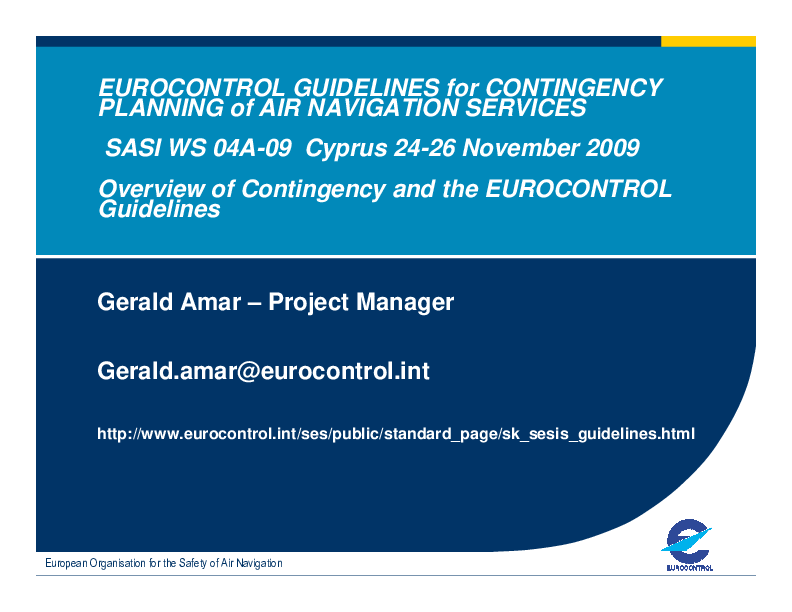 This small presentation provides an overview of the regulatory aspects related to contingency and introduces the project EUROCONTROL Guidelines for Contingency of ANS.
