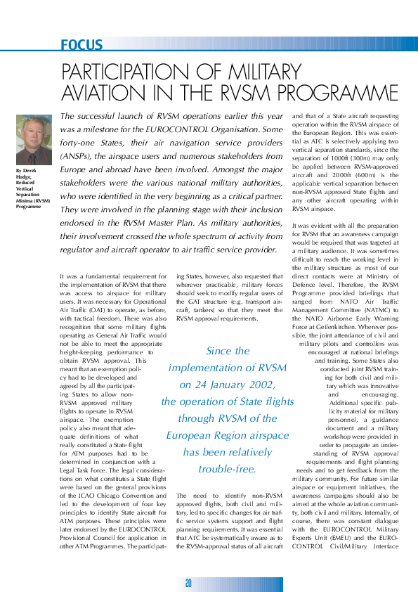 Military authorities are a critical partner in the RVSM programme. Their involvement crossed the whole spectrum of activity from regulator and aircraft operator to air traffic service provider.