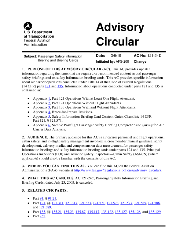Passenger Safety Information Briefing and Briefing Cards, AC 121-24D