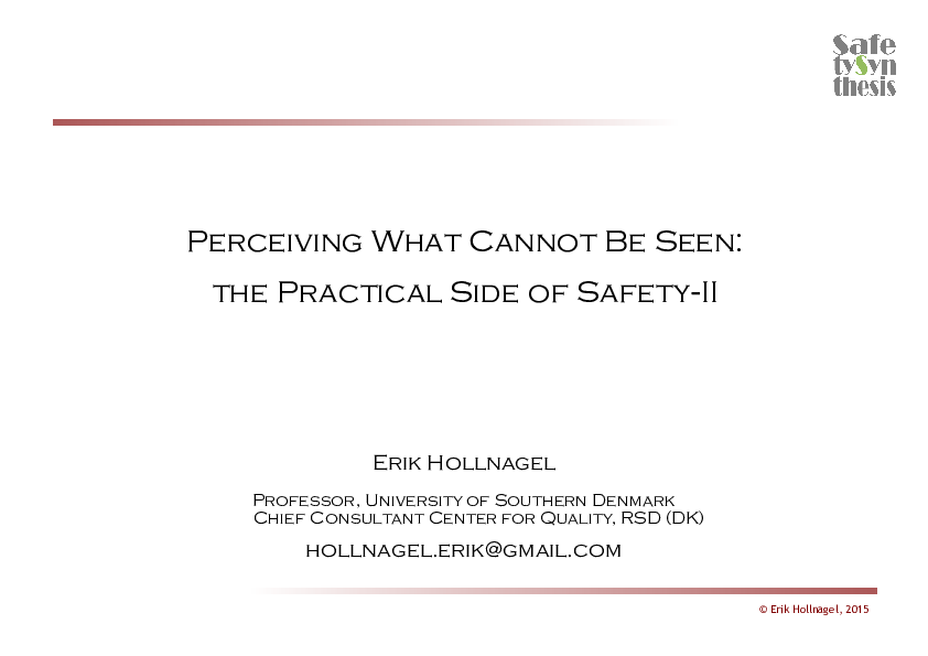 This presentation is about the practical side of Safety II. We need to understand everyday performance in order to improve safety and Safety II is achieved by trying to make sure that things go right, rather than by preventing them from going wrong.