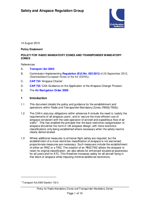This document details the policy and guidance for the establishment and operations within Radio and Transponder Mandatory Zones (RMZs/TMZs).