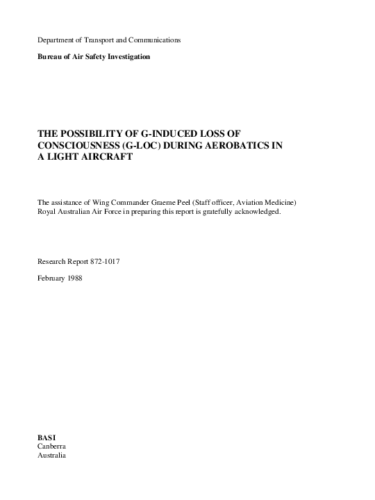 The possibility of G-induced loss of consciousness (G-LOC) during aerobatics in a light aircraft, Australian Bureau of Air Safety Investigation (BASI) Research Report 872-1017 (1988)