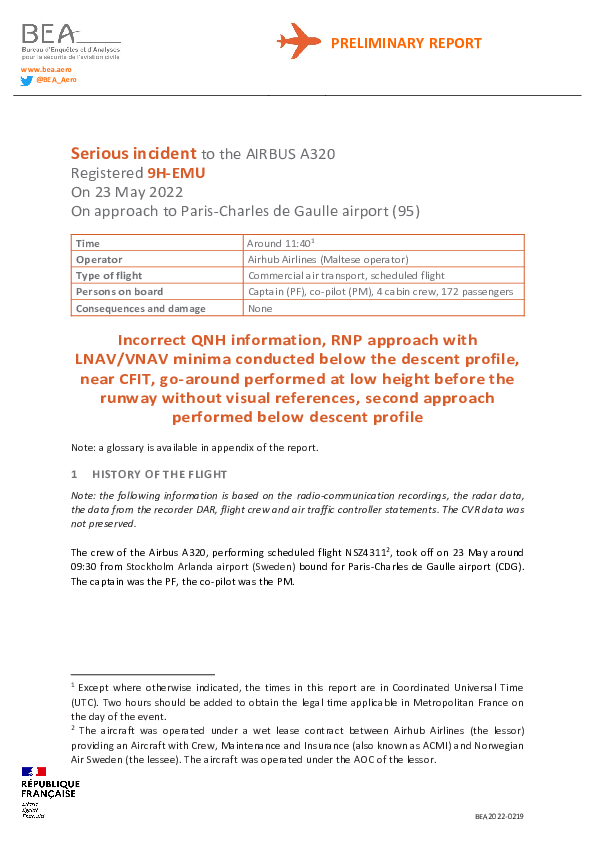 Preliminary Report A320 (9H-EMU), vicinity Paris CDG France, 23 May 2022