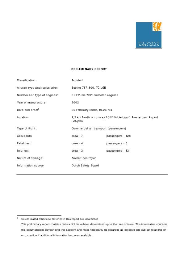Preliminary report regarding Turkish Airlines 737-800 crash on 25 February 2009 on final approach into Schiphol airport, Amsterdam.