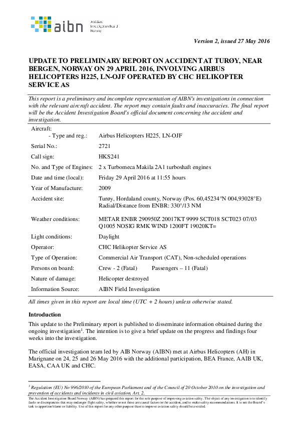 Preliminary report (Combined 13.05, 01.06.2016 and 28.06.2016), accident, Airbus Helicopters H225, B
