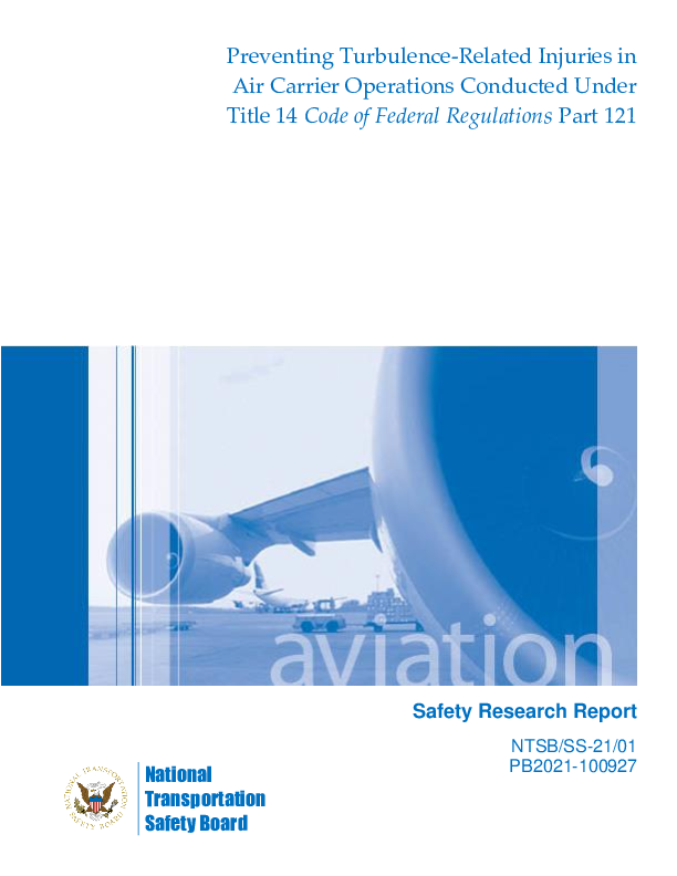 This safety research report examines the prevalence and risk factors of turbulence-related accidents in Title 14 Code of Federal Regulations Part 121 air carrier operations; assesses the effectiveness of policies, programs, technologies, and other applicable safety countermeasures; and makes recommendations for improving turbulence avoidance and injury mitigation. To conduct this research, the National Transportation Safety Board (NTSB) used both quantitative and qualitative methods, including a literature review, aggregate analysis of aviation accident data, and interviews with a broad selection of government, industry, and other stakeholders. In addition, the NTSB conducted 10 detailed investigations of turbulence-related Part 121 accidents over the course of this research. The NTSB identified the following safety issues: (1) insufficient submission and dissemination of turbulence observations, (2) a lack of shared awareness of turbulence risks, (3) the need for mitigation of common turbulence-related injury circumstances, and (4) the need for updated turbulence guidance. As a result of this safety research, the NTSB makes 18 new recommendations to the Federal Aviation Administration (FAA), 2 new recommendations to the National Weather Service, and 1 new recommendation to Airlines for America, the National Air Carrier Association, and the Regional Airline Association. The NTSB also reiterates three recommendations to the FAA and classifies and reiterates one additional recommendation to the FAA.