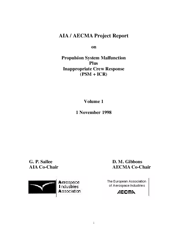 Aerospace Industries Association (AIA) and European Association of Aerospace Industries (AECMA) Report on Propulsion System Malfunction and Inappropriate Crew Response (PSM+ICR) Vol. 1 [CAST SE136 Output 00]