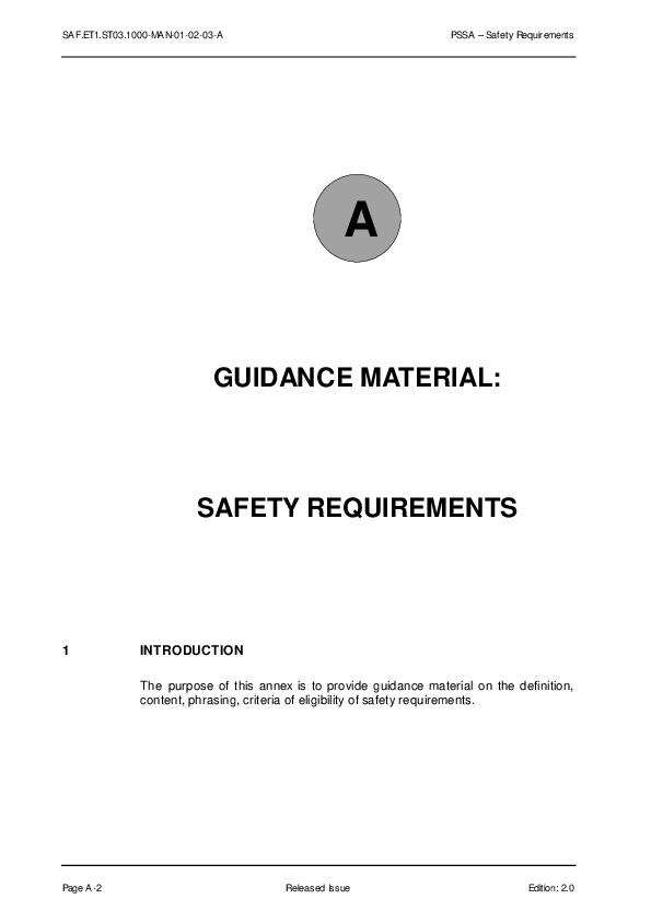 This guidance material provides guidance on the definition, content, phrasing, criteria of eligibility of safety requirements. It also includes the process to allocate Assurance Levels (Procedure: PAL and Software: SWAL).